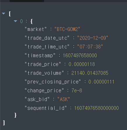 대충 이런식으로 포맷이 나오는데 내가 원하는 리턴값[0].trade_price 항목이 최근 거래 가격이다.