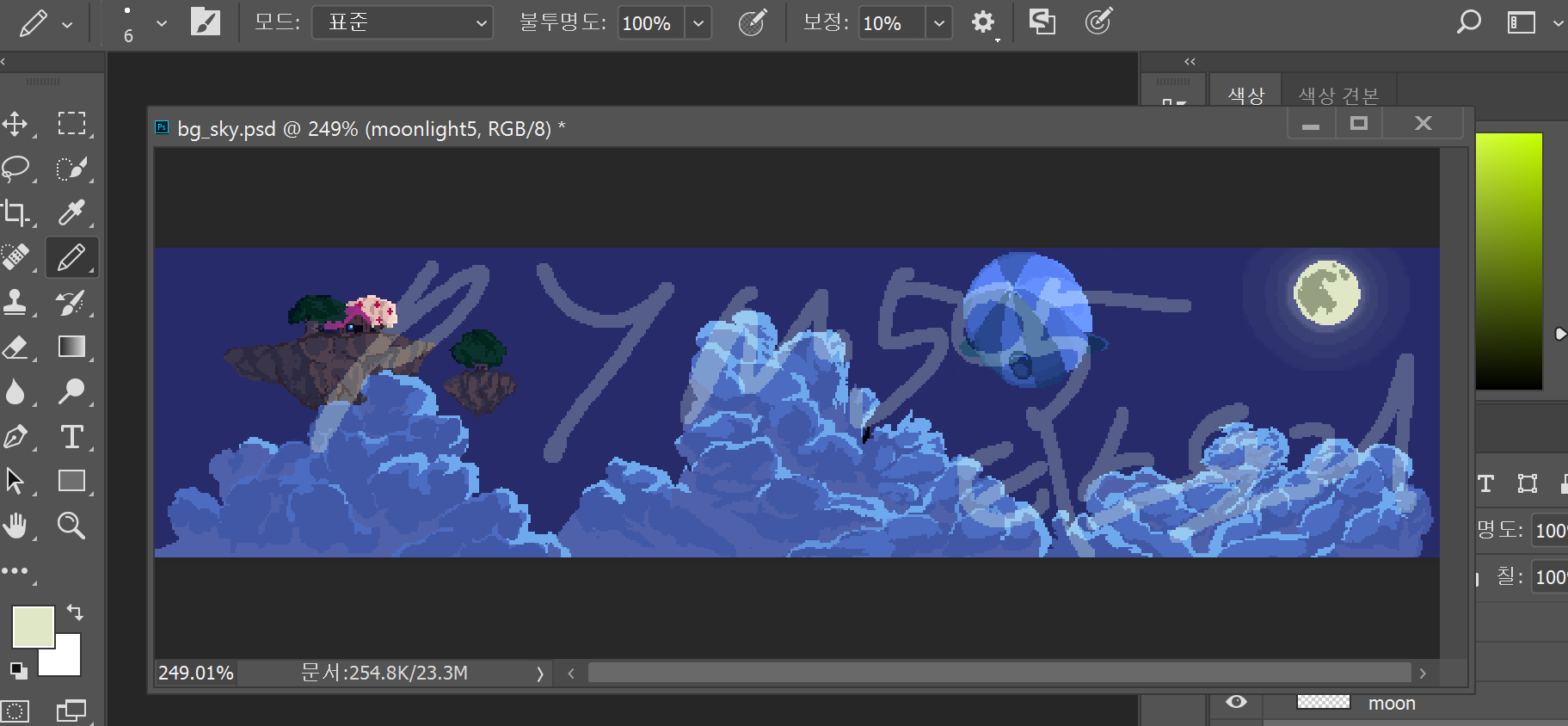 도트 + 포토샵으로 그렸다. 구름을 그릴때가 가장 어려웠다. 아무래도 정형화된 모양이 없다 보니 더 힘든 것 같다.