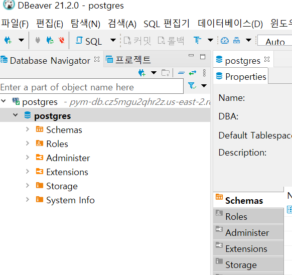 DB 명은 자기가 칭한 데이타베이스 이름으로 접근이 안된다면 postgres를 입력하고 접근해보자.