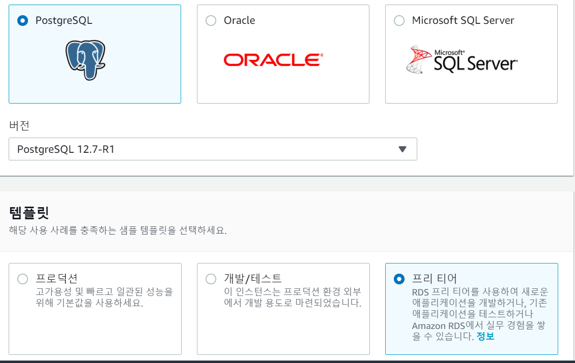 aws 로그인 이후, RDS 서비스 -> 데이타베이스 생성 -> PGSQL 선택 후