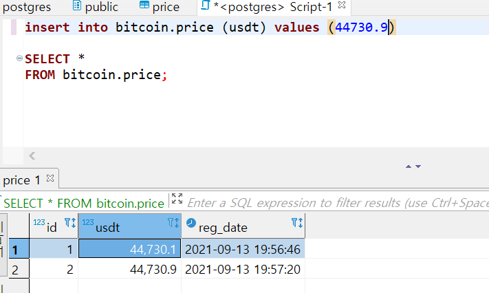 2. price는 USDT 달라 테더이므로, 소수점이 필수라 플롯 형태를 채용했다.