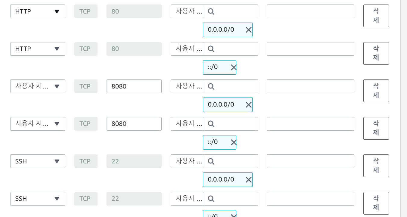 3-2. 접속 방화벽 설정 -> 보안 규칙 - > 보안 그룹 -> 인스턴스에 지정된 보안 그룹 들어가서 아래와 같이 어디서든 ssh와 익스플로러로 접속 가능하게 설정한다. http,https,ssh,사용자 지정(8080포트) 만들고 사용자 접속은 각자 0.0.0.0/0 , ::/0으로 추가 한다.