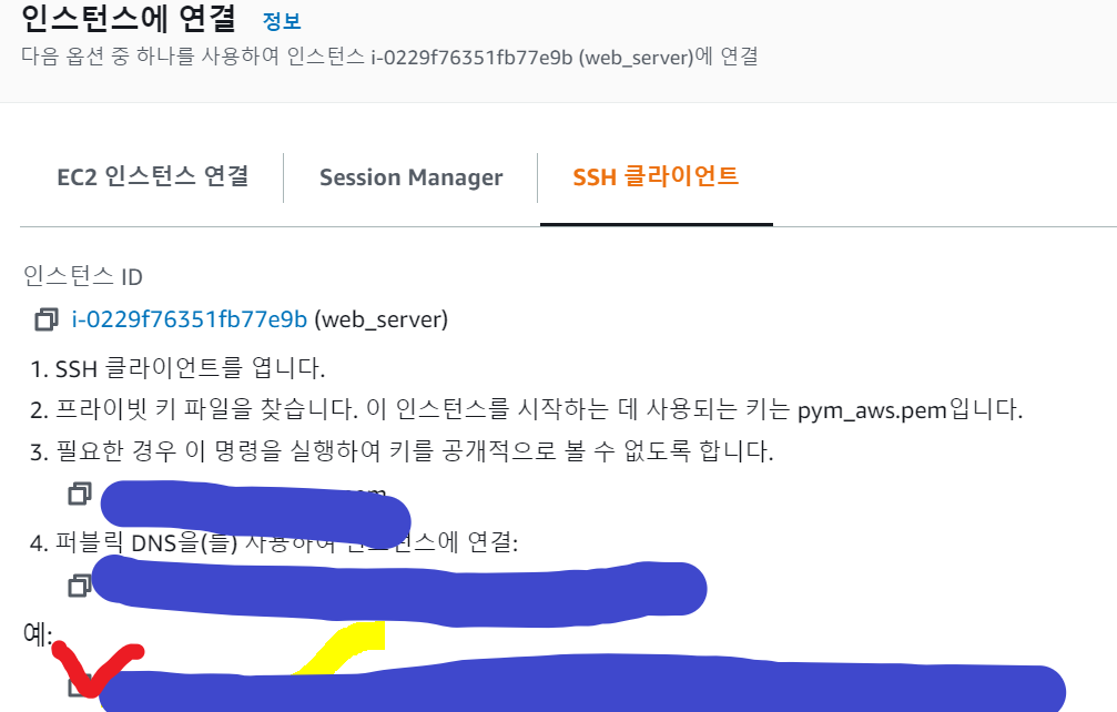 4-4 aws 홈페이지 인스턴스 오른쪽 클릭 -> 연결 ssh 이용한 연결 탭으로 들어가서 ssh 명령어를 복사한다.